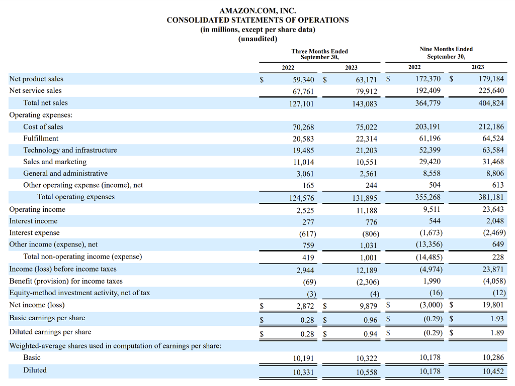 In the above screenshot, we can see that Amazon provides the company’s income statement for the Three Months Ended September 30 for both 2022 and 2023. To the right of that is the same information for the Nine Months Ended September 30. This is in contrast to the 10-K, which shows three years of income statement and cash flow statement data.