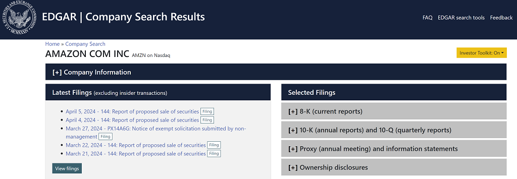 Below is a screenshot of Amazon’s filings as retrieved by EDGAR. On the right-hand side, you can see that 10-Ks and 10-Qs are highlighted under “Selected Filings.”