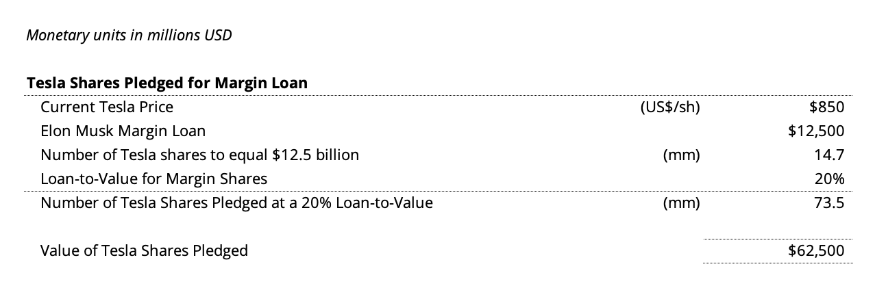 Musk will borrow US$12.5 billion using a margin loan collateralized by Musk’s ownership of Tesla stock. If we use a recent Tesla price of US$850/share and a 20% Loan-to-Value, this implies that Musk will need to pledge roughly 73.5 million Tesla shares to secure this margin loan. These shares are valued at roughly US$62.5 billion as shown below.