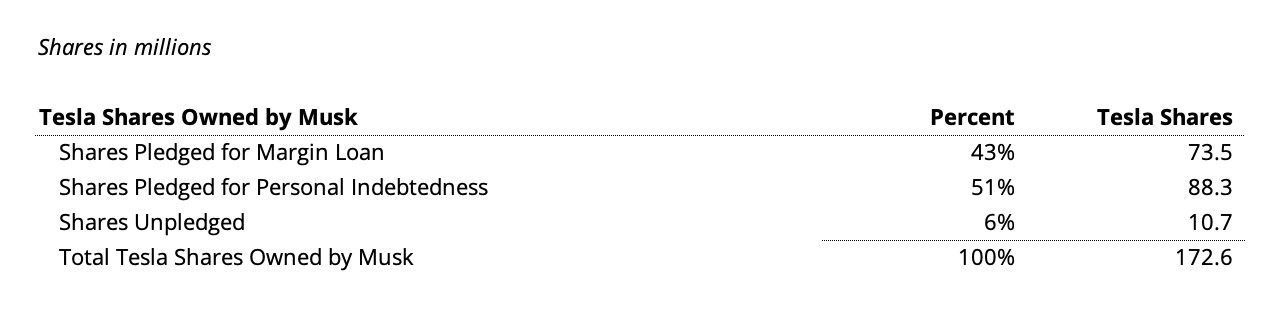 Per last year’s Tesla proxy statement (from August 2021), Musk has roughly 88.3 million shares already pledged as collateral to secure certain personal indebtedness as shown below. He currently owns approximately 172.6 million Tesla shares. Assuming the 88.3 million shares are still pledged as other collateral, and including the shares pledged for the margin loan, Musk has pledged 94% of his Tesla stock ownership.