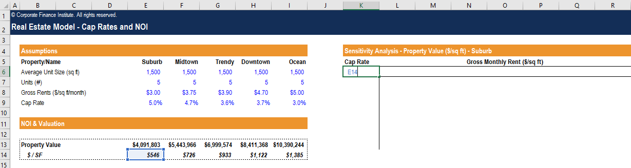 9. The sensitivity table is now filled in, showing the range of values based on different rental rates and cap rates for this property.