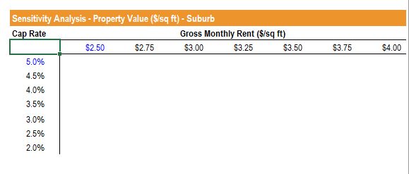 Now, we will perform a sensitivity analysis on the suburb property values, based on the gross monthly rent ($/sq ft) and cap rate.