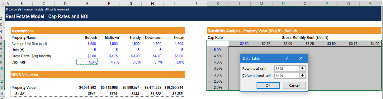 8. Now, we will show the suburb property value/SF in the middle of the table using the Data Table function. Select the entire sensitivity table, press ALT + A + W + T to open up the Data Table window. For row input cell, select the Suburb Gross Rents ($/sq ft/month) which is $3.00. For the column input cell, select the Cap Rate for Suburb which is 5.0%. Press OK.