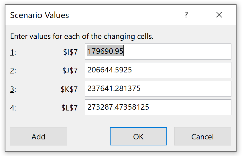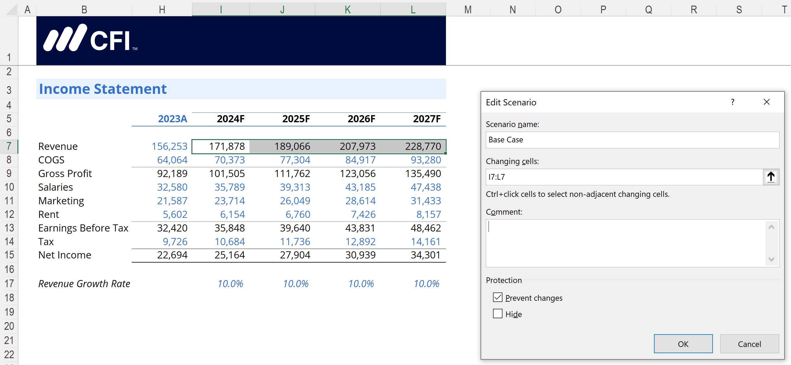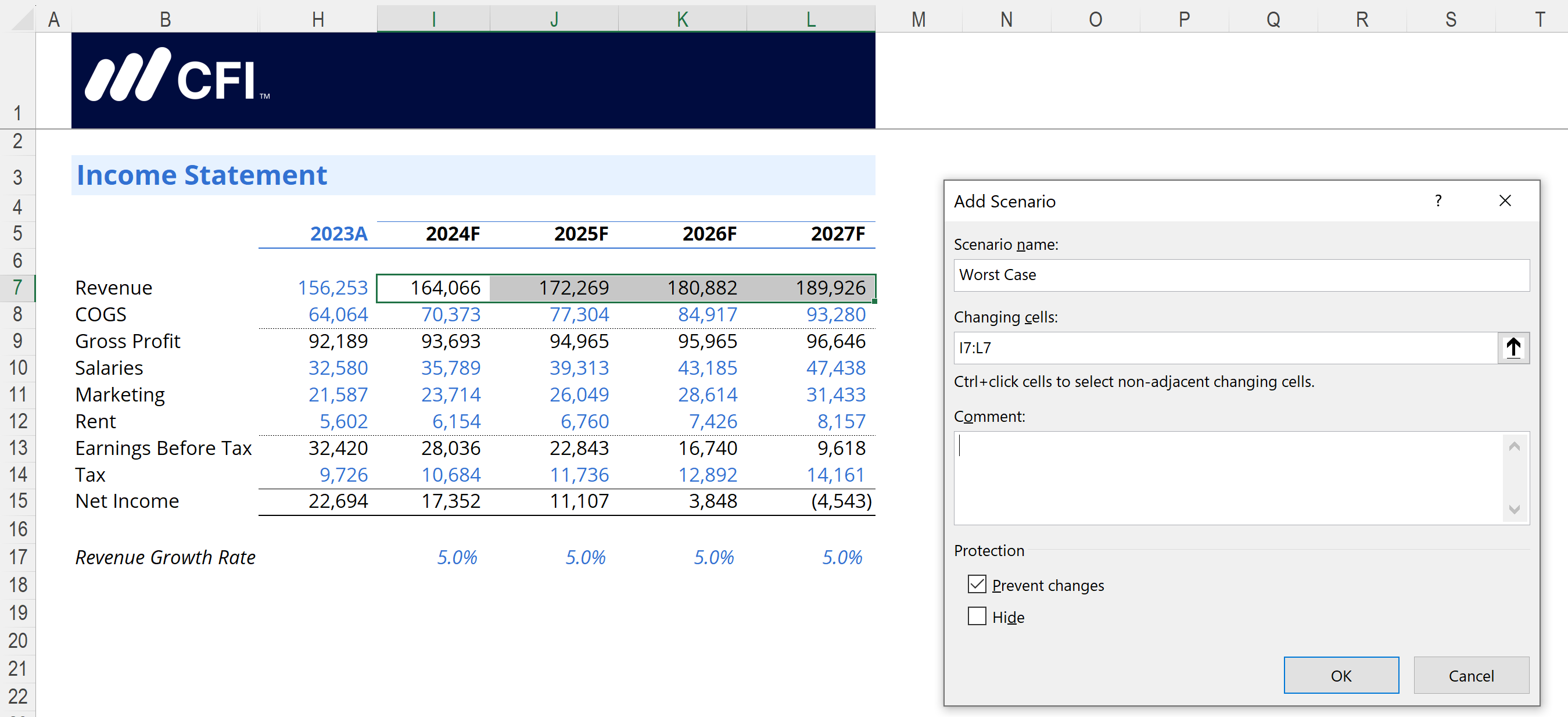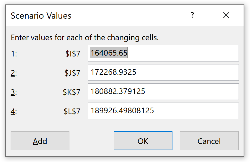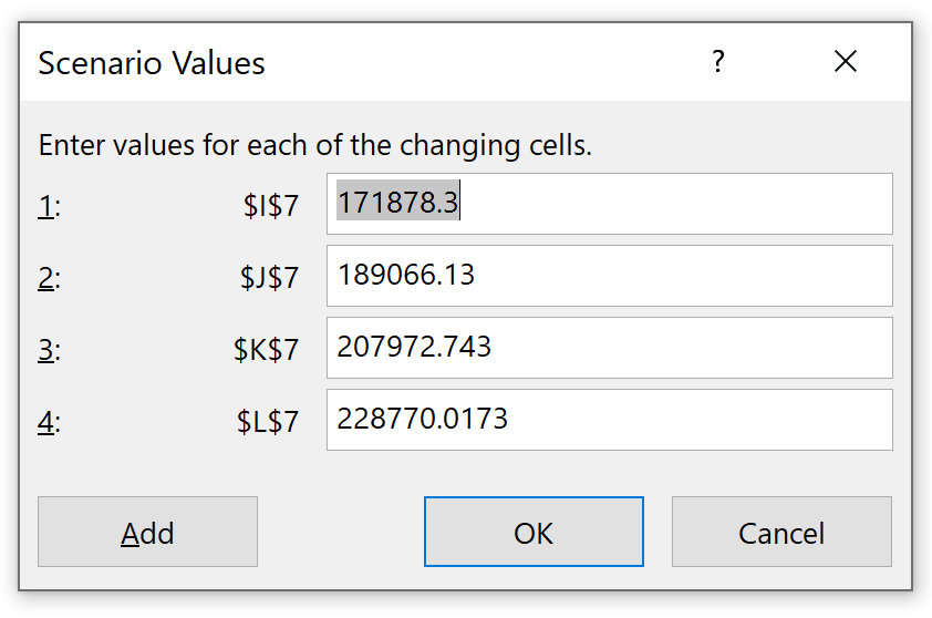 Repeat the process to add a Best Case. This scenario will adjust the forecasted Revenue values for 2024-2027, so we only need to select those cells in the Changing cells field.