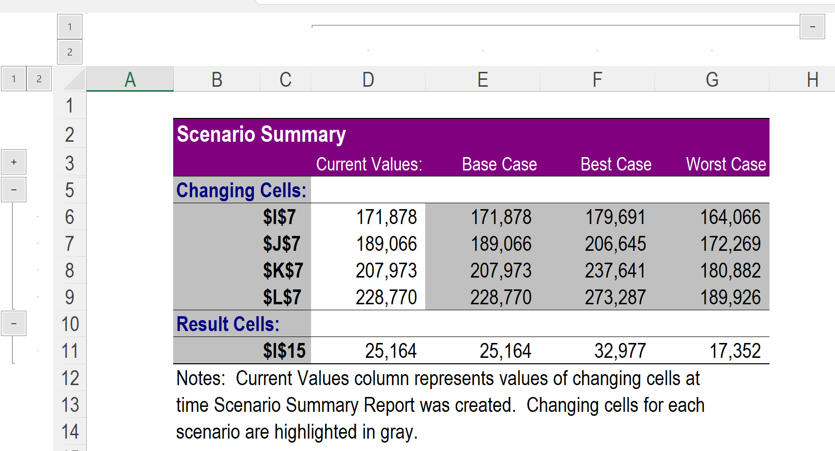 After clicking OK on the above warning, Excel will then show you what the exact numbers in the appropriate scenario will be. Below, we see the Base Case numbers.