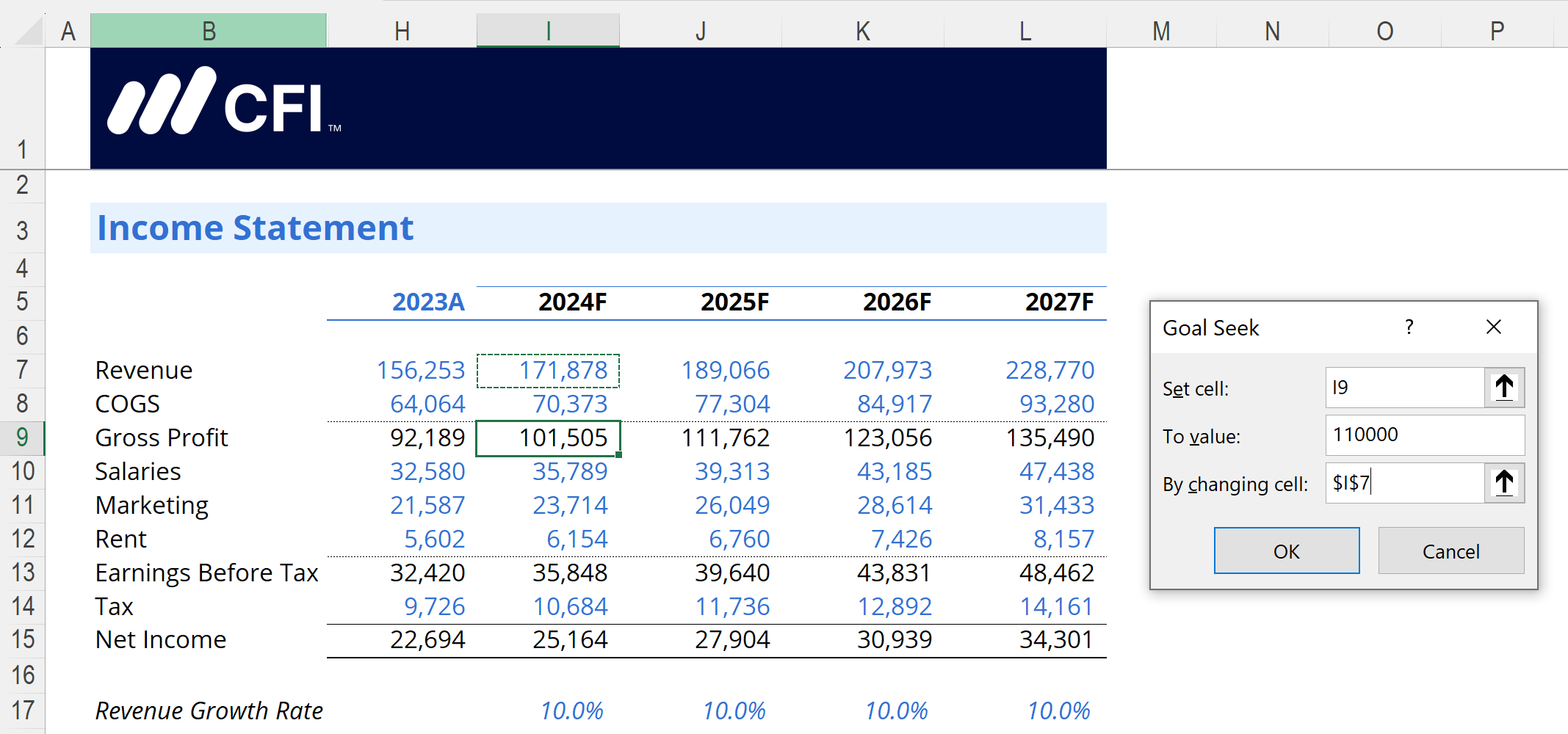 Set cell: Select the cell that contains the 2024 Gross Profit value ($101,505). In our example, this is cell I9.