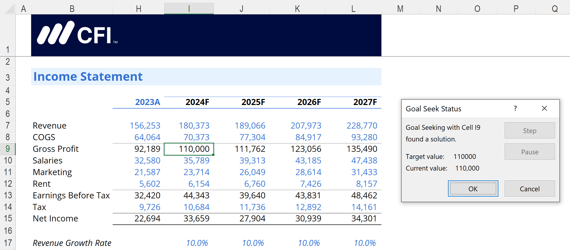 Click OK to run Goal Seek. Excel will adjust the Revenue value until the Gross Profit reaches your target of $110,000.
