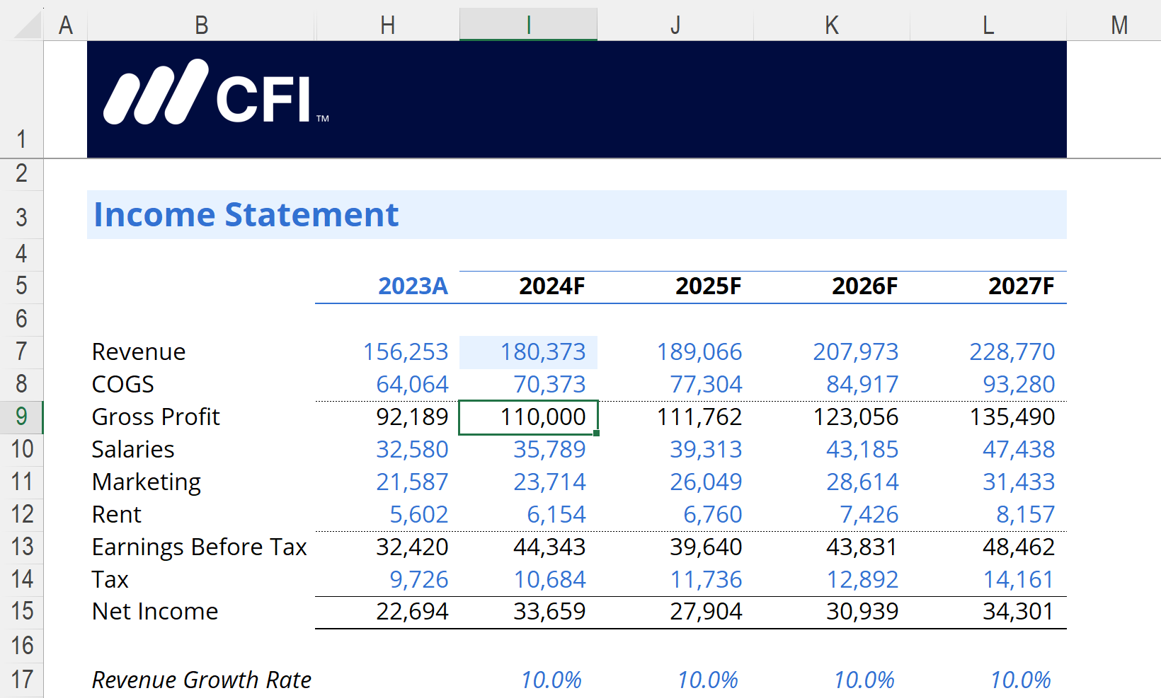 Make sure your model has clear calculations for Revenue, COGS, and Gross Profit for each year. The Income Statement forecast model shown below assumes a revenue growth rate of 10% per year.