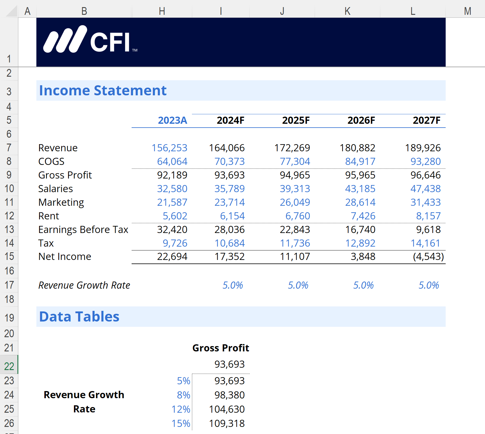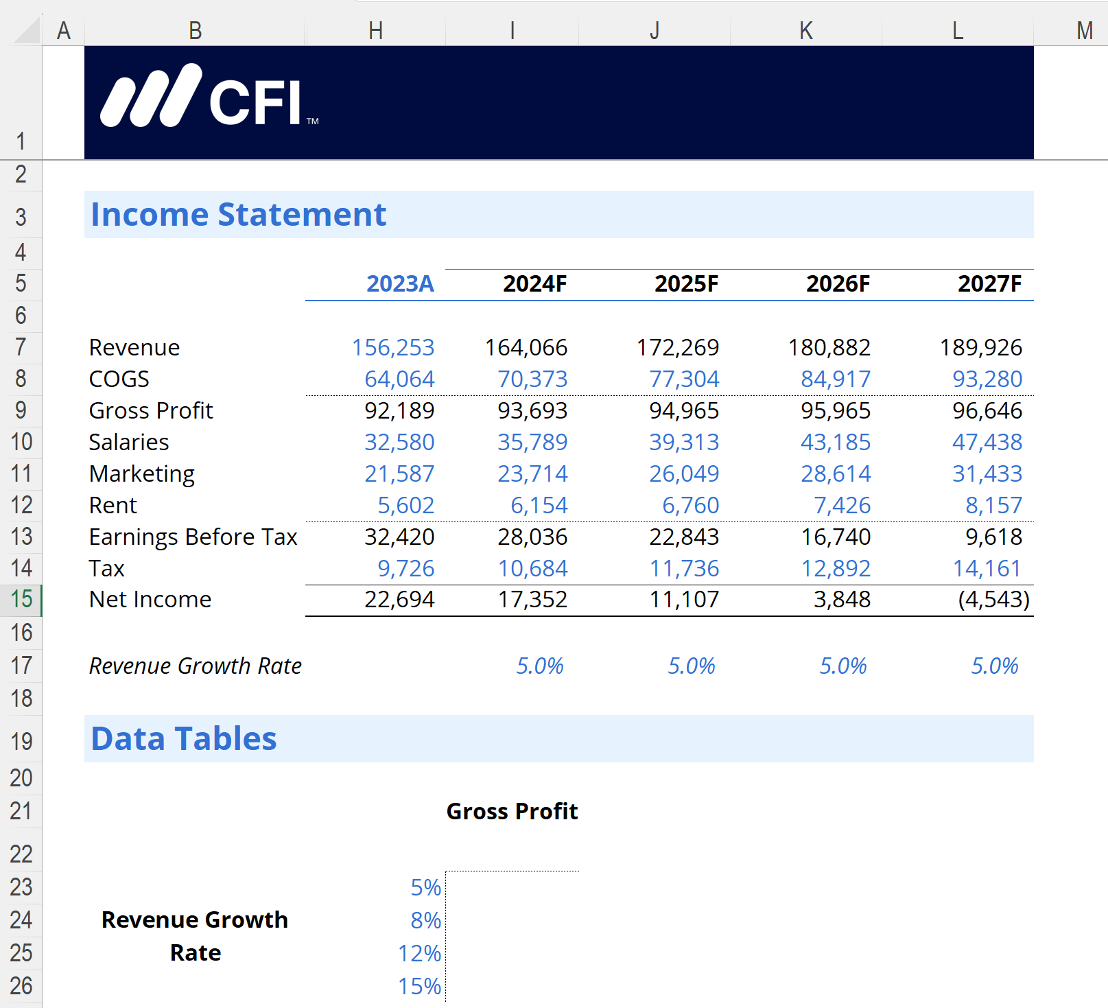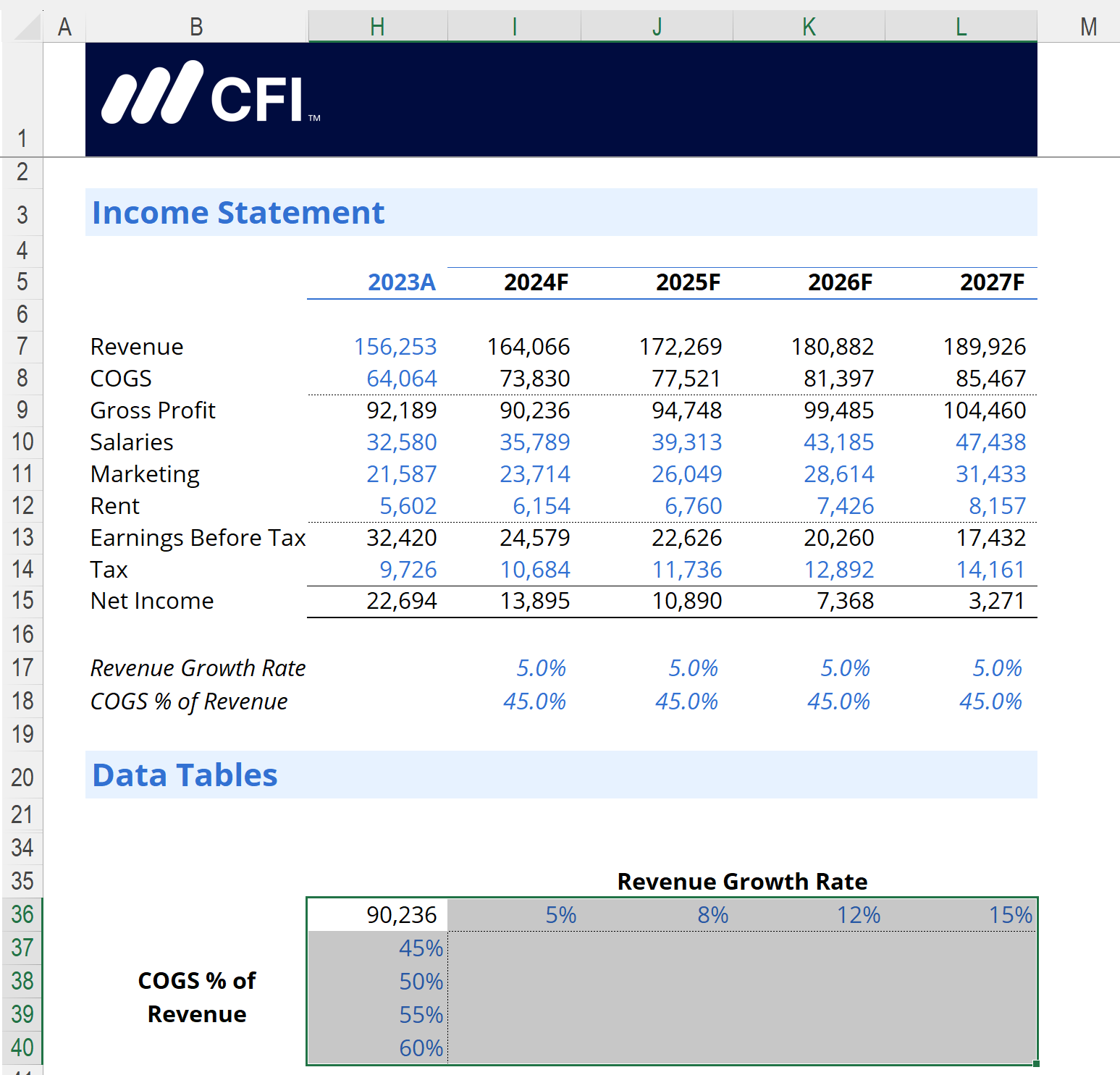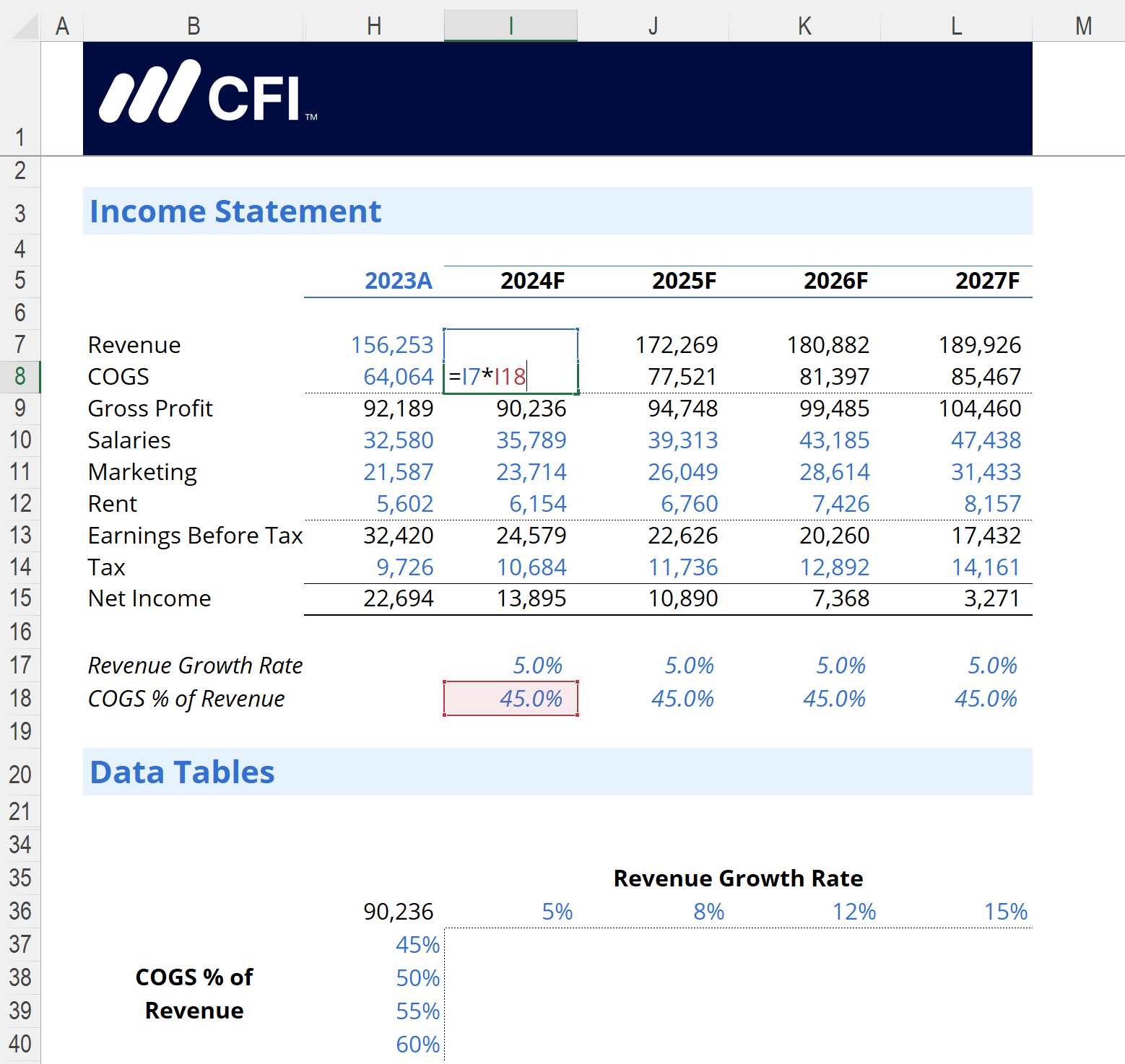 This formula takes the 2023 Revenue value and adjusts it by the growth rate shown below the Income Statement. This will update automatically when you run the Data Table.