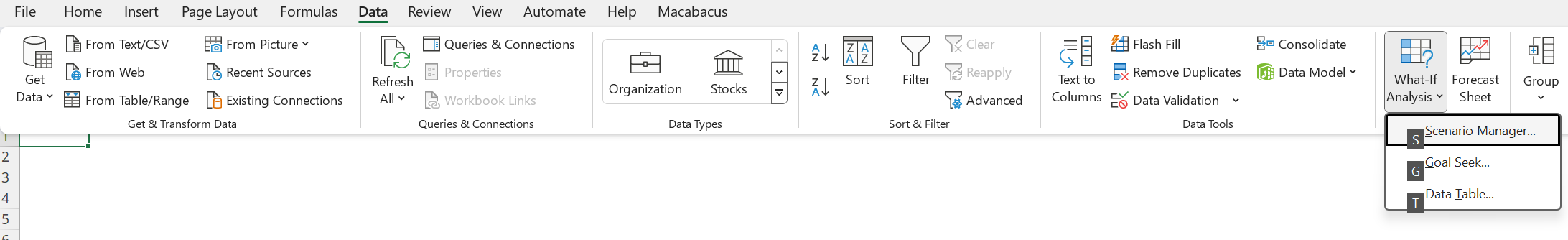 Navigate to the Data tab on the ribbon. Select What-If Analysis, then Scenario Manager.