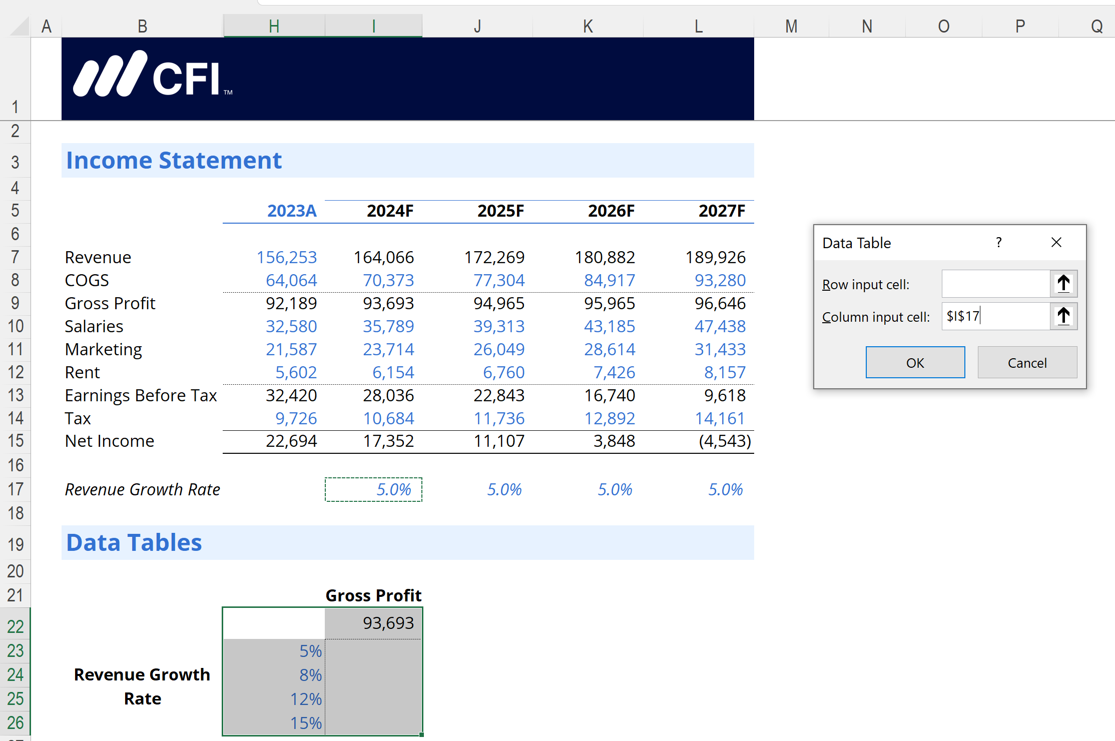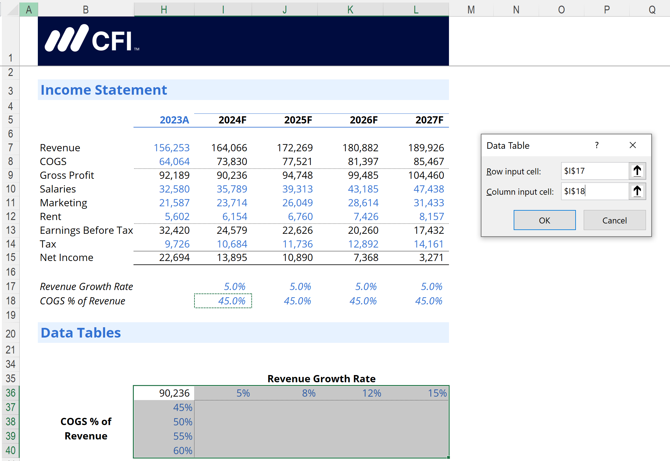 Set the input cells. The Row input cell should be referenced to the 2024F Revenue Growth Rate assumption (cell I17 in our example). The Column input cell should be referenced to the 2024F COGS % of Revenue (cell I18 in our example).