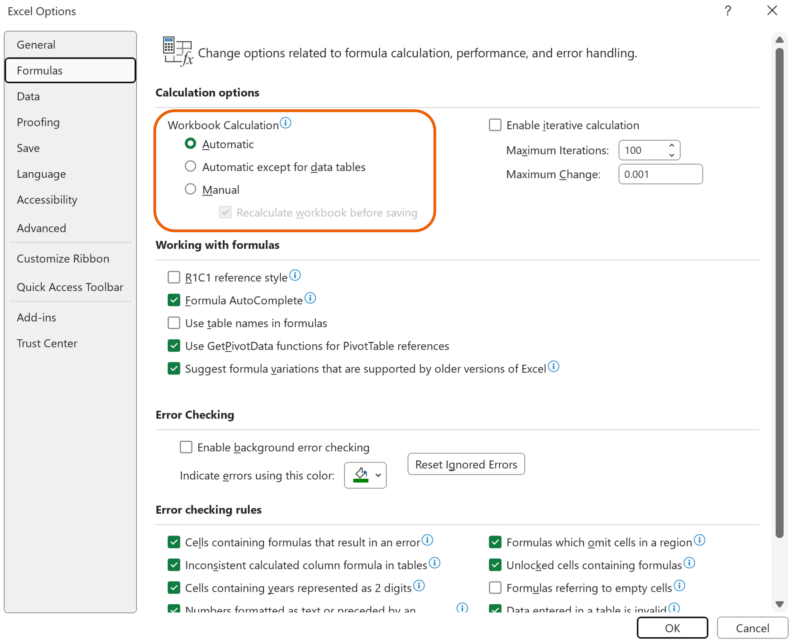 Note: Depending on your Excel settings, the Data Tables may return one number. This is due to Calculation options in Excel. You can access various Excel settings by going to File then Options. As shown below, if Workbook Calculation is set to Automatic, then the Data Tables should return the proper results. If the calculation is set to Automatic except for data tables, then you will need to calculate the workbook when you want the correct results (F9 is the PC shortcut key to calculate everything in a workbook; alternatively, go to Formulas on the Excel ribbon and then click Calculate Now).