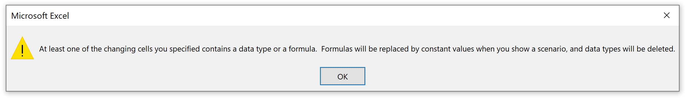 Depending on your version of Excel, when you click OK you might see the below warning. Basically, Excel is warning us that when we decide to activate a scenario our formulas will be replaced with hardcoded numbers (in this case revenues).